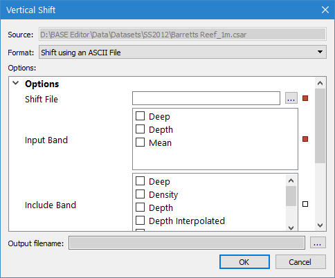 The elevation values in a raster surface band can be used to apply a vertical shift to the values in another coverage. Shift values can be applied to a single elevation band, for example the Depth band, or to multiple elevation bands, such as Depth, Deep and Shoal bands.