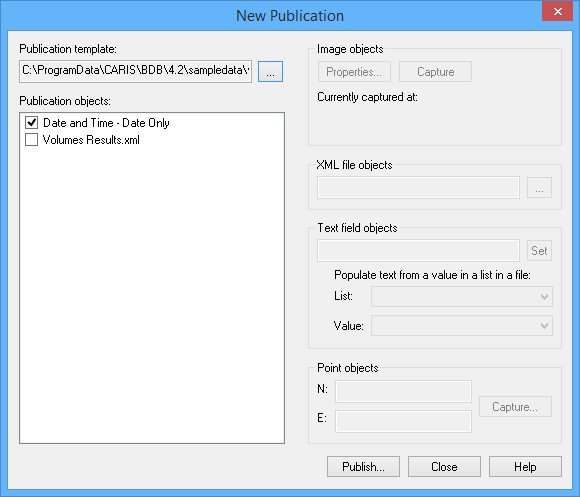 As you select each publication object, you may notice fields in the different “objects” groups: Image, XML file, Text field, or Point, become enabled. These fields allow you to define settings for the currently selected publication object. For more information on the object properties fields, see the Publication topic in the CARIS BASE Editor Reference Guide.