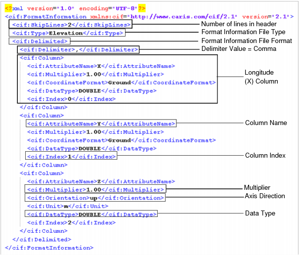 The information provided in a format information file varies greatly depending on the task at hand and the data available. Some files may simply provide the positional attributes, while others may define additional attributes available in the source dataset (e.g., Uncertainty, Temperature).