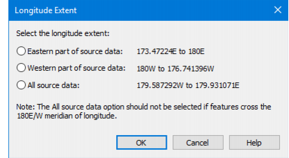 | [Create New Product From Dataset or Create New Product from Multiple Datasets commands only] The S-57 standard does not allow products that straddle or cross the 180° meridian. If data crosses the meridian in any of the input datasets, this button is displayed. 1. Click to open the Longitude Extent dialog box. |