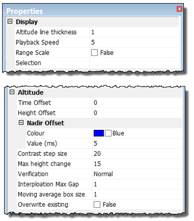 Nadir Offset | Strong solid returns in the water column, such as surface reflections, can be compensated for by setting an offset from nadir in raw data mode. The nadir line colour is set to Blue. To change colour: 1. Click in the Colour field and select a new colour from the colour picker. 2. Type a value in milliseconds for the Nadir Offset Value. The Contrast Step Size and Max Height Change options must also be set to correctly auto digitize the side scan. |
