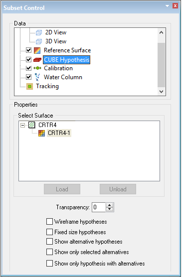 The hypothesis editing options for the selected surface are listed at the bottom of the Subset Control window.
