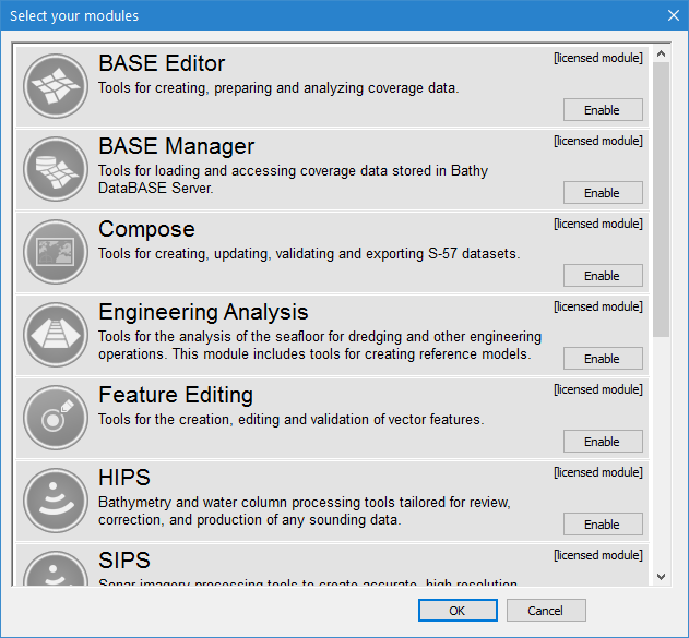 Enable or disable Teledyne CARIS licensed software modules that are available in the application. Modules provide sets of tools meant for specific work flows and data types. Separate licenses are required for some modules.