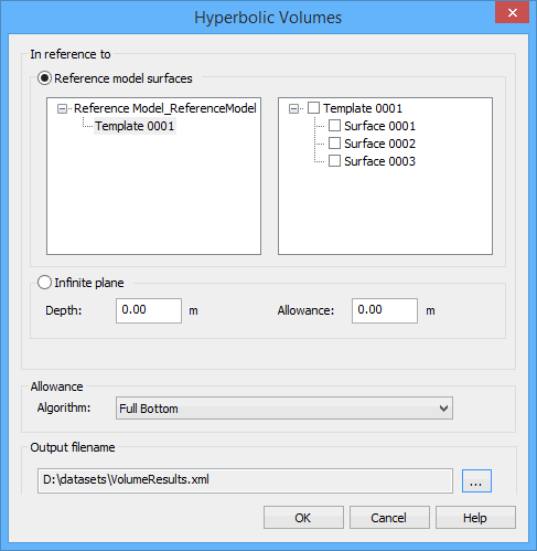 Infinite plane | This option is used if calculating volumes using an infinite plane. When using this option, you must specify depth and allowance values for the reference plane. |