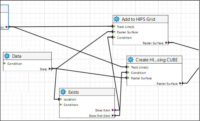 In the process model image below, conditions specified in the Exists tool are connected to the Conditions ports in the Add to Surface and Create HIPS Grid using CUBE tools.