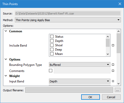 Bias | Define whether the maximum value or the minimum value of the selected attribute should be retained during thinning. If the application is using the positive-down z-axis convention, a minimum bias would be used to retain the shoalest values. In a positive-up application, a maximum bias should be used to retain the shoalest values | |