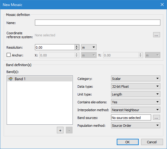 The Band definition fields are used to define the bands that will be present in the resulting raster mosaic. The Band(s) list contains the bands that have been selected for inclusion and is used to enter names for the bands. By default, Band 1 is displayed and selected for the settings to be defined.