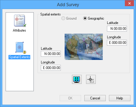 Display Window | 1. Select Ground or Geographic as the coordinate type. 2. Click the Display Window Extents button. The Display window extents are copied into the Coordinate fields. |