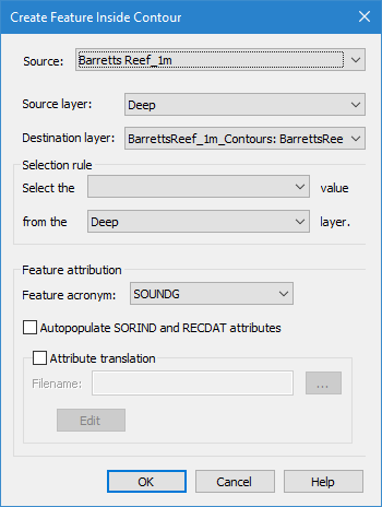 Feature acronym | The Feature attribution fields allow you to define the type of features to create and metadata values to assign to the features. If you do not wish to create features or populate attributes, these fields do not need to be populated and will be disabled if a Designated surface layer is selected as the Destination layer. The feature type of the new features is controlled by the Feature acronym field. The drop-down list for this field is populated according to the feature catalogue of the selected destination layer. The default selection will be the first sounding type feature in that catalogue. |
