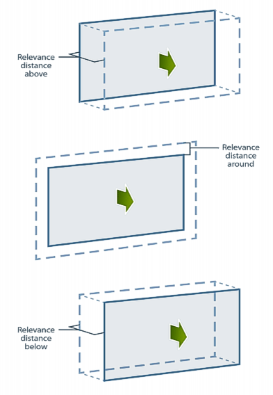 Relevance distances define the distance from a plane to be considered when importing data and creating raster surfaces relative to reference model surfaces, such that distant irrelevant features are not included. Relevance distance can be set above, below or around a plane.