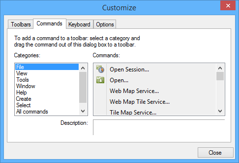 The commands in the category are displayed in the Commands list. A description of the command is displayed in the Description field.
