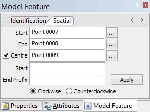 If you selected a curved alignment, the Centre point feature field is active. The Start, End Prefix, and Clockwise/Counterclockwise options are only active for curved alignments (i.e., when the Centre checkbox is checked).