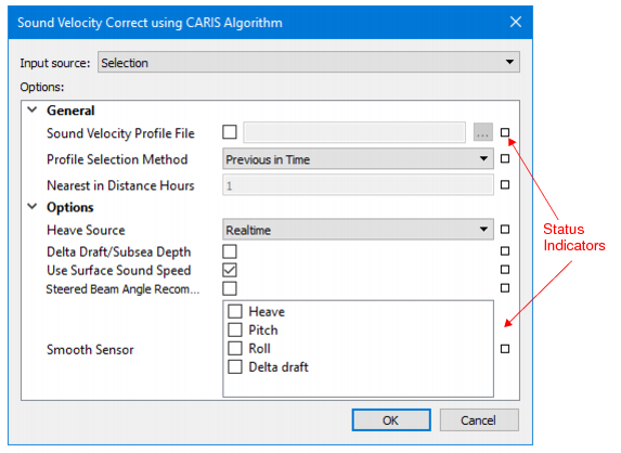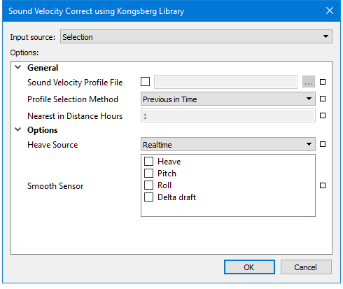 Smooth Sensor | 1. Select which smoothed sensor data is to be applied during sound velocity correction: Heave, Pitch, Roll, Delta Draft. Sensor data can be smoothed in the Attitude Editor. |