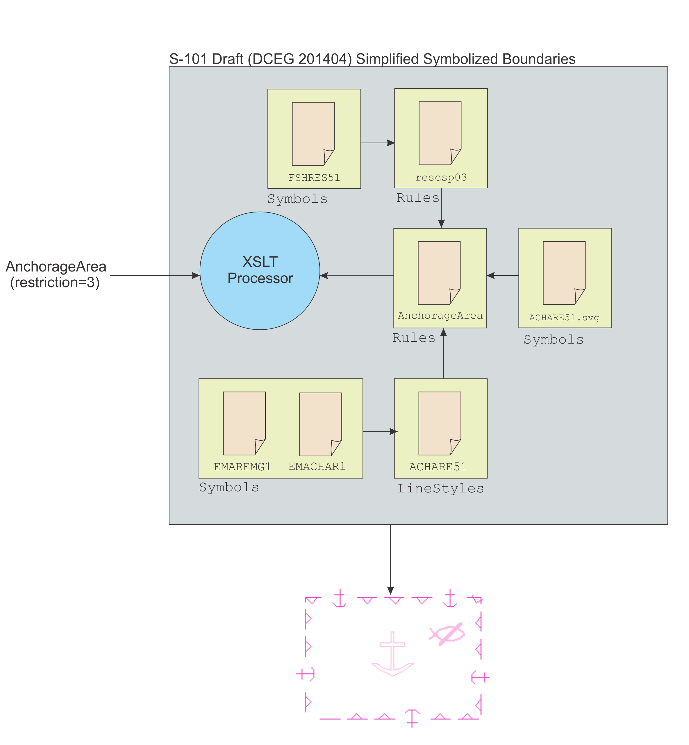 The following image shows how the S-101 files in the Portrayal Control File are used to draw an Anchorage Area feature.