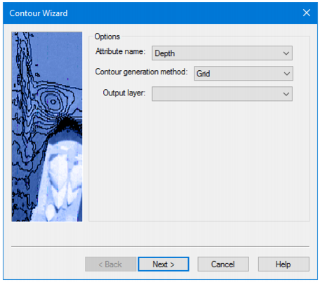 The Output layer list displays feature layers or HOB file layers that can be used to store the contours.