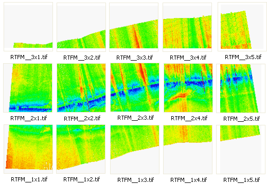 When creating a tile set, each file will be numbered according to the location of the tile in the surface. The tile number is in the format "RxC", where R and C are the row and column index of the tile. The tile number will be included in the file name for each tile, along with the Output name assigned for the export format. For example, If you were exporting a GeoTIFF image to tiles with RTFM set as the Output name, the resulting files would be numbered as follows: