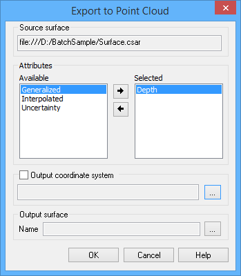 Attributes | The Attributes lists are used to select the attribute bands to be included in the resulting point cloud. The Available list contains all attributes present in the source surface. The Selected list contains all attributes selected for inclusion in the export. To select attribute bands for the export: 1. Select an attribute in the Available list. 2. Select the right-arrow button. To remove an attribute: 1. Select the attribute in the Selected list. 2. Click the left-arrow button. The primary Z layer is mandatory and cannot be removed from the Selected list. |