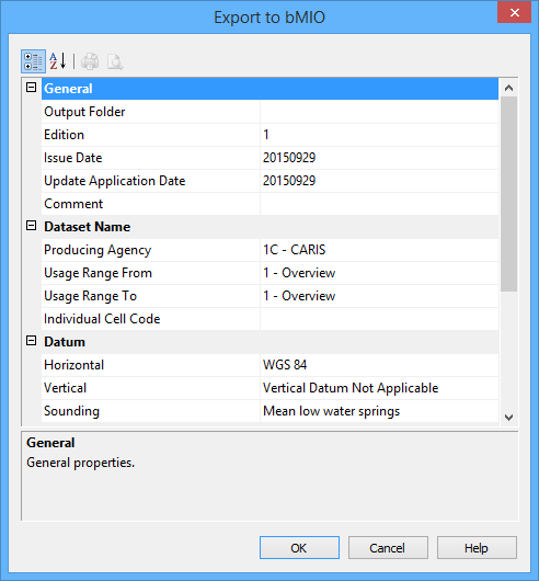 The Export to bMIO command uses the following dialog box. As you select each property, a brief description is displayed in the Description Panel at the bottom of the dialog box.