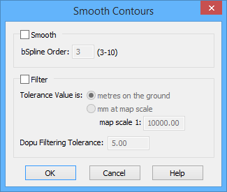 This option is used to apply filtering to the vertices in the selected contours. You can choose to filter by metres on the ground or by millimetres (mm) at map scale, which requires you to enter a scale.