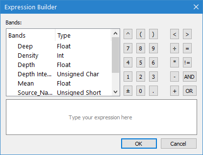 The Expression Builder dialog box is used to create a filter expression by typing in the expression field or selecting options from the Bands list and the operator buttons. The expression field also provides the following functionality to assist in expression creation: