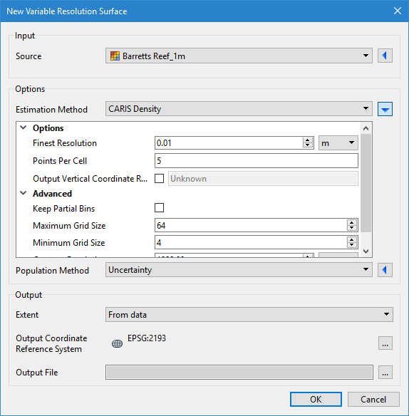 • CARIS Density: Using this method, resolution values are estimated based on source point density. This method provides an adaptive, binning-based algorithm to run on arbitrary point sets containing multibeam or single beam data. It calculates tile sizes based on density rather than using a fixed size and avoids point clusters with a greater density in individual tiles, ensuring accurate overall resolution estimates. This method is useful when working with source data that contains point clusters and has large variations in depth ranges.