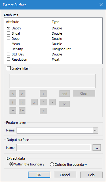 Attributes | A list of all bands present in the source surface and the type of data contained in the bands. Click the check box of each attribute to be included in the extracted surface. The primary Z band (Depth, Height, etc.) is mandatory and cannot be turned off. Also, any designated points within the selected area will automatically be included in the extraction. |