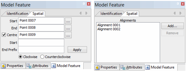 If you selected a curved alignment, the Centre field is enabled and populated. The browse button (...) can be used to change this point. The Start, End Prefix, and Clockwise/Counterclockwise options are also enabled. These fields are only enabled if the Centre field is populated (i.e., when the Centre checkbox is checked). With these fields, new prefix values can be entered and the direction of the alignment can be changed.