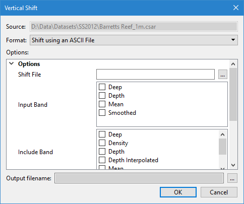 The elevation values in a raster surface band can be used to apply a vertical shift to the values in another coverage. Shift values can be applied to a single elevation band, for example the Depth band, or to multiple elevation bands, such as Depth, Deep and Shoal bands.