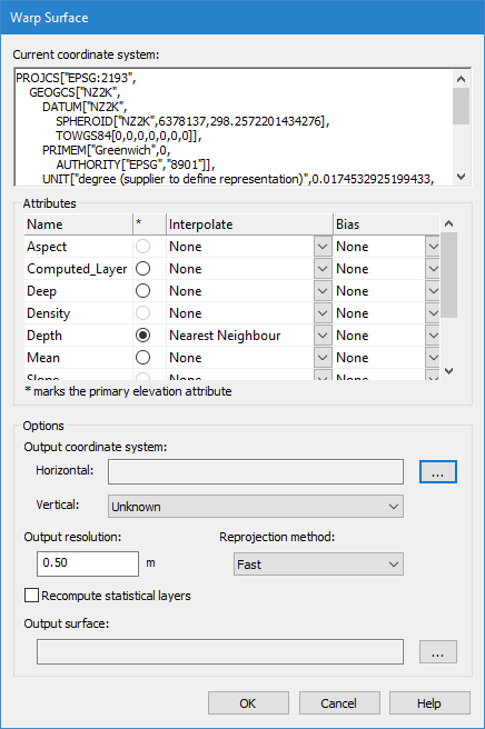 The Attributes field contains a table of the bands of the surface. If your source surface is a raster surface, also listed are the options for interpolating and/or applying a biased selection of node values from the data for the new surface.