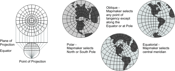 Type | Azimuthal. Geometrically projected on a plane. The point of projection is at the surface of the globe opposite the point of tangency. |