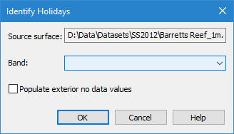 The classification information is added to the surface as a new band. All holiday bands are named according to the band that was classified and appended with the word “Holidays”. For example, if the Depth band of a surface were selected, the resulting band would be called “Depth and Holidays”. This band can be removed from the surface, if needed, using the Remove Band command. See Remove Band for more information.
