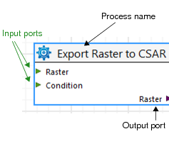 Port | Linkage points on a tool. A port links data to a particular parameter of a process, for example, input, output, condition and options. • An Input port is used for data to which the process is applied, for example, the Track Lines(s) port points to the location of the data.. • Output is what is produced by the process, such as a CSAR file or a surface. Process tools only have one output port. • See also Condition port. | |