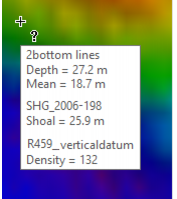 This will cause all raster grids, point clouds, reference models, TINs and variable resolution surfaces that are turned on, and have data at the cursor location, to be listed in the tooltip as sources along with their band values. The example below displays these values for three different coverages.