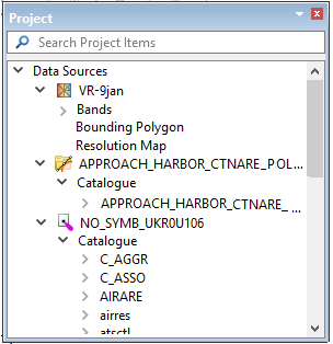 Data sources are listed in the Project window with their features, bands or attribute items displayed below each data source name. For example, Catalogue items can be expanded to see the feature objects present in the catalogue of the data source. A CARIS file could list each feature type (polygons, lines, names, soundings, and symbols). CSAR files have bands such as intensity, depth, weight values, etc.