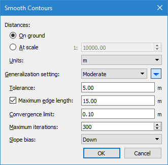 Slope bias | This option is used to define the direction bias of smoothing for contours that have a populated contour slope (cntdir) attribute, which is only available if the contours were generated using the Bathy DataBASE catalogue. For hydrographic purposes, Down guarantees a hydrographically safe result and is the default value. This setting should only be changed for specific tests or if smoothing towards higher elevation is explicitly desired. This option is only displayed if some of the selected contours do not have a populated contour slope attribute value. |