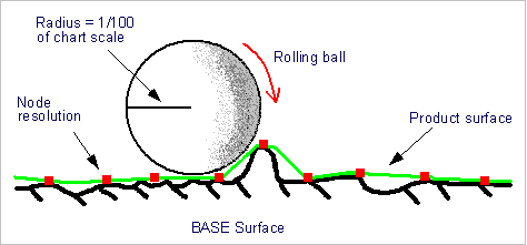 • 3D Double Buffering: This process smooths the raster surface to reduce clutter and highlight significant shoals. Double buffering is like rolling a ball over the surface at an interval determined by the suface’s node resolution. The radius of the ball is determined from the chart scale (radius = 1/100 of scale). As the ball is rolled over the surface, the surface is smoothed, but the shoals are retained. The concept of double buffering is illustrated below.
