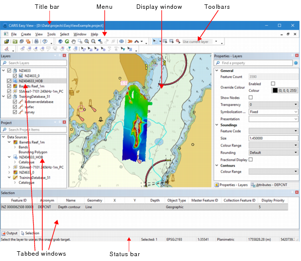 Display Window | The Display window contains the open map or chart. You can have one 3D display window and multiple 2D display windows open at the same time, if desired. The Display window is the only window that cannot be moved or docked. |