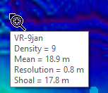 In the 2D window, moving your cursor over a surface or coverage will make a tooltip box appear. This will display the name of the source of the active dataset, and the value of the active band or layer at the location under the cursor. The image below shows an example of values for four of the bands in a CSAR surface.