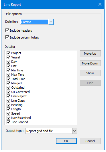 The saved report will contain a table of values under the same column headings that can be viewed in the Detailed Line Query window.
