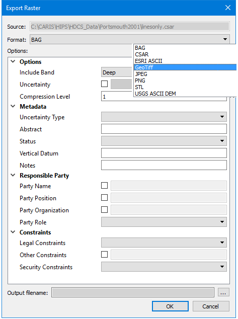 Options | The options for the selected output format. The available options will differ based on the selection in the Format drop-down list. If you hover the mouse cursor over the name of an option, a brief description of the option is displayed in a tooltip. If the BAG format is selected, options are also provided for the BAG Metadata. |