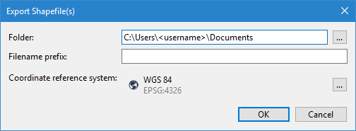 Each set of files will be named according the feature acronym for which they were created. For example, if a Coverage object were selected, the resulting files would be named Coverage.shp, Coverage.shx, Coverage.dbf and Coverage.prj. A prefix can be specified for the filename if desired.