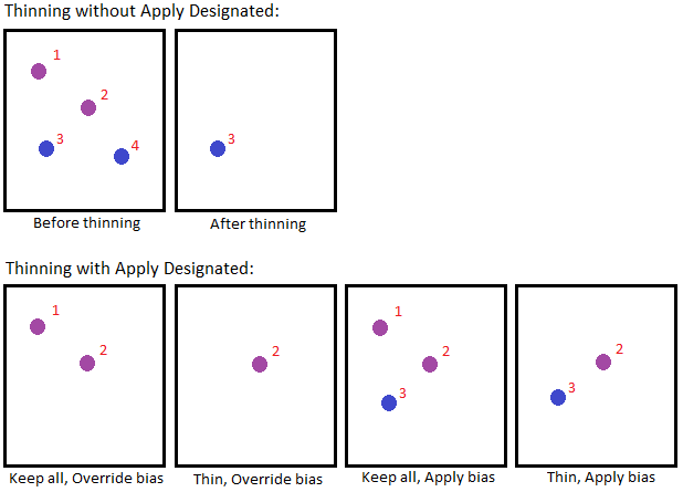 Apply Designated | Select this option to include designated soundings in the output and define how they should be handled during thinning. • Multiple Designated: This setting defines how to handle designated soundings that are closer to each other than the specified minimum distance. You can opt to include all designated soundings or thin them, according to the specified settings and include the remaining designated soundings. • Bias Relevance: This setting defines how to handle designated soundings that are closer to normal points than the specified minimum distance. You can opt to thin points according to the specified settings and include the designated soundings as well, or override the specified settings and include only the designated soundings within the specified radius, thinning all other points in the same radius as the designated sounding. 1. Click the check box to enable the Apply Designated fields. 2. Select an option from each drop-down list. | |