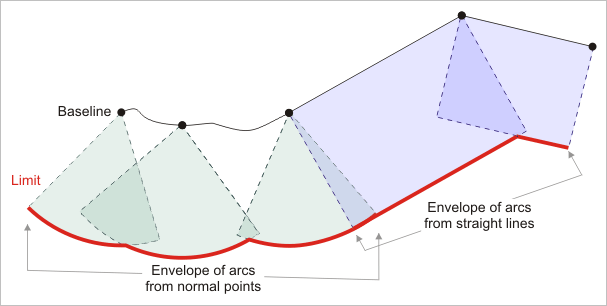 The limit line is created around the end points of the lines with a semicircle at the specified distance from the base point. A vertex in the semicircle is generally added at each one degree of arc. If that would result in subsequent vertices that are more than one nautical mile (1,852 metres) apart, a constant spacing of one nautical mile is used instead. If it would result in vertices closer than ten times the map resolution, then ten times the map resolution is used instead.
