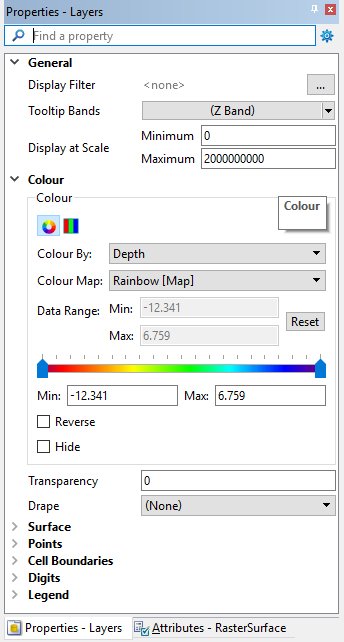 The Drape property, also in the Colour properties, allows an image to be draped over a raster data layer. See Draping Images for information on this property.