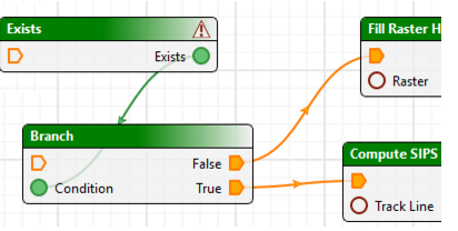 This conditional tool splits an output path based on a Boolean value. Branch tools can be connected to the Exists process, by selecting the Create branch command from the right-click menu on the Exists tool.
