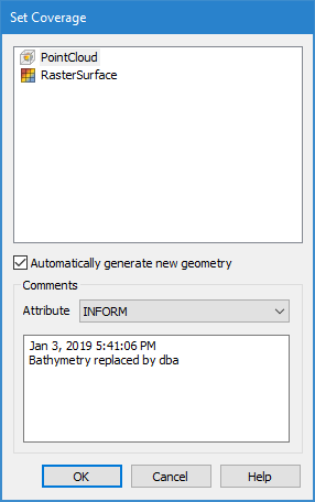 The Set Coverage command is used to associate a coverage to an existing database object. This can be done to add a coverage to an object that is not currently associated with any data, or to replace the coverage to which an object is already associated.