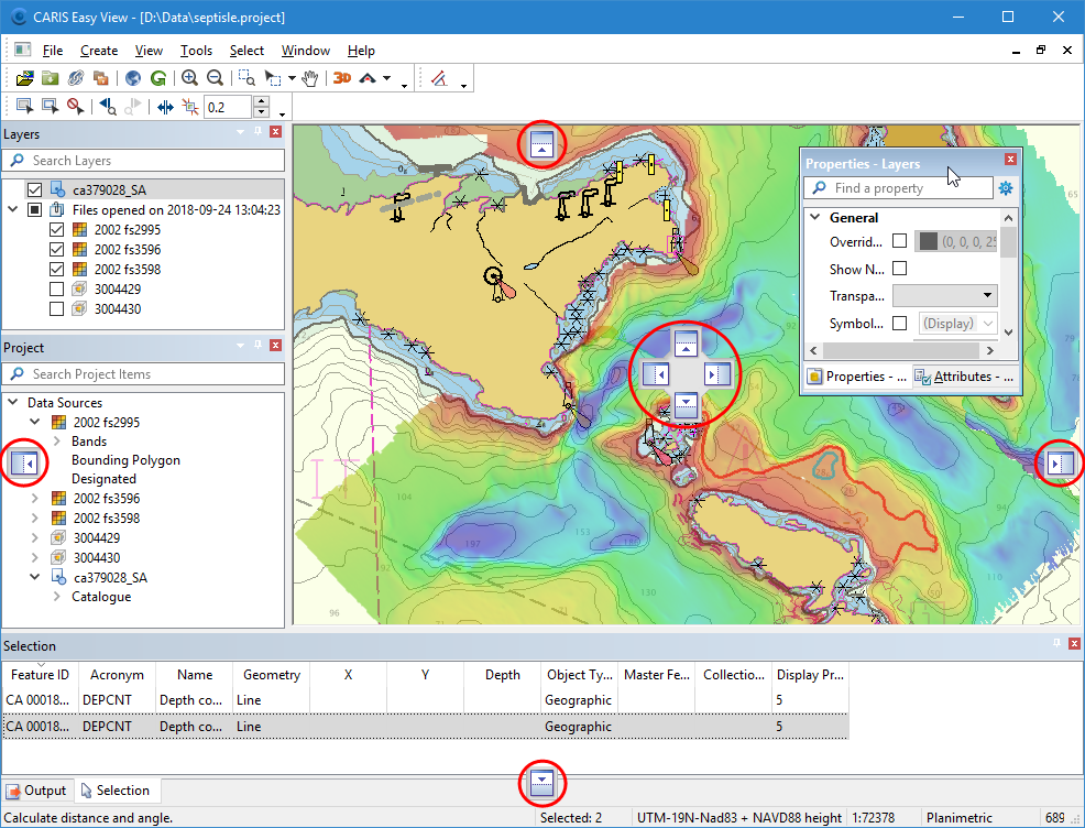 Selection | The Selection window displays information about data or features selected in the Display window. The information displayed depends on the type of data selected. For any fields that display coordinates or measurements, the format and units of these values are controlled by the Units settings in Tools > Options. For example, coordinates can be displayed as Geographic or Ground, length and area values can be projected or geodetic, and depth values can be in a number of units |