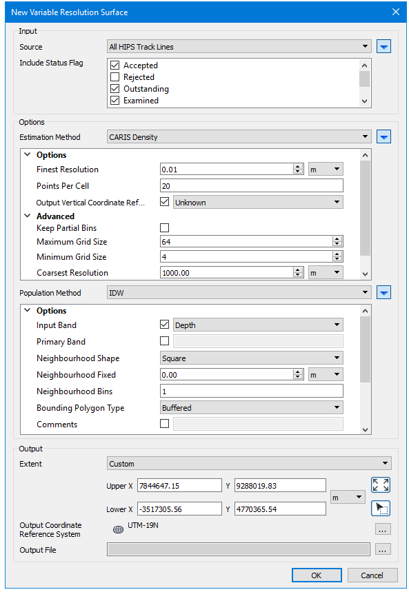 Variable resolution surfaces can be created from track lines, raster surfaces or point clouds. Parameters for creating the surface are set in the New Variable Resolution Surface dialog box.