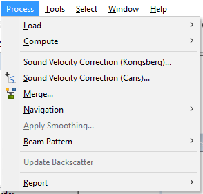 Use the Process menu to load tide, to compute processes such as TPU and Towfish navigation. The Merge function is also on the Process menu. Corrections for Sound Velocity and Beam Pattern can also be applied from the Process menu.