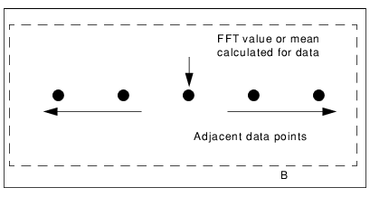 In the following example, the box size is set to five data points. A FFT value or mean for any data point is calculated from itself and ‘the two data points on either side of it (if available).